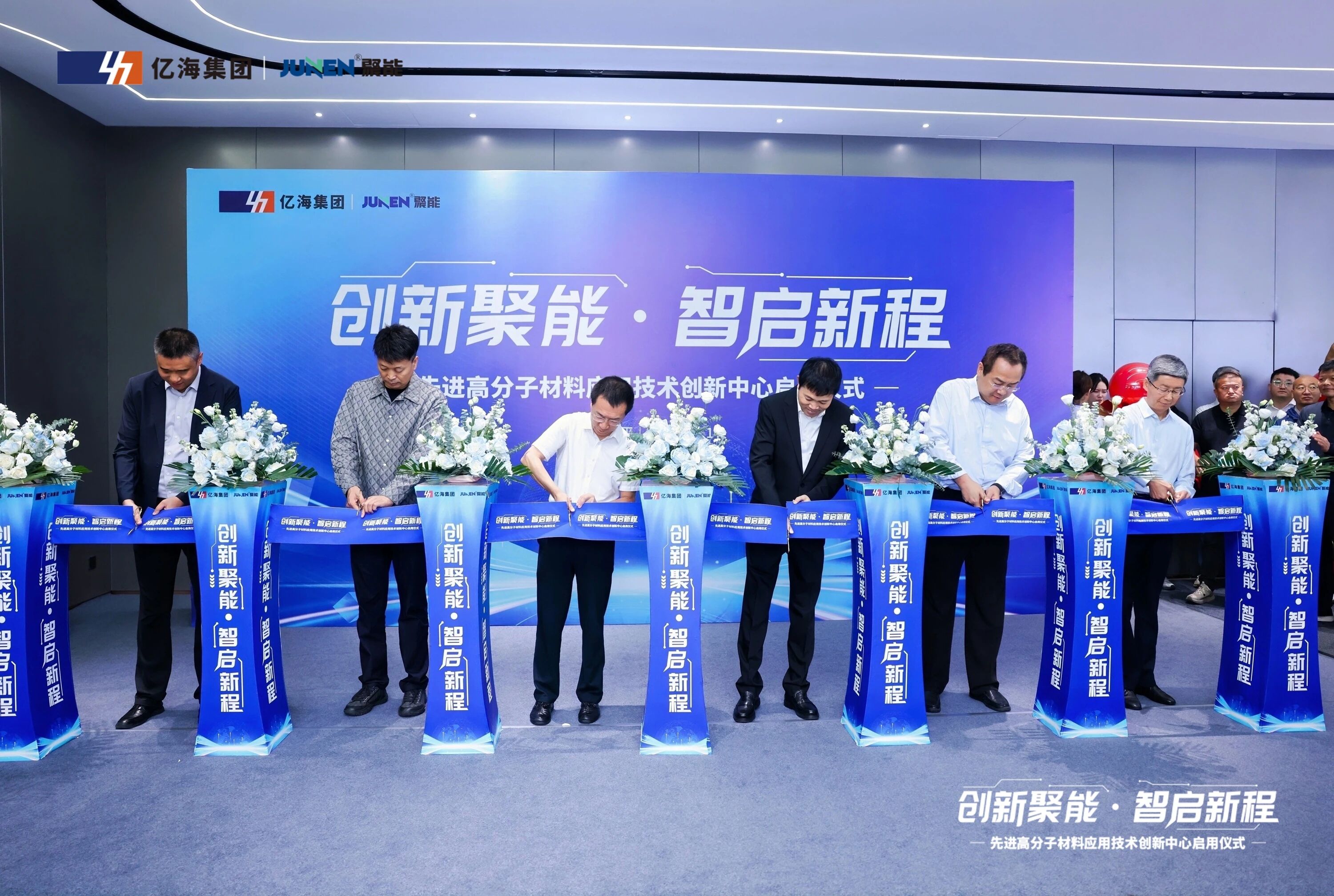 活动迎来最激动人心的剪彩环节。在全场嘉宾的注视下,六位重要嘉宾移步台前:陕西省工信厅谢韬处长、省塑料工业协会李伟会长、中国塑协赵克武副秘书长、西安子洲商会张旭会长、亿海集团李军董事长、聚能塑胶刘建总裁。随着礼仪小姐呈上金剪,金剪落下,掌声雷动,标志着陕西聚能先进高分子材料应用技术创新中心正式启用。嘉宾们共同举杯,镜头定格下这一珍贵的历史瞬间。